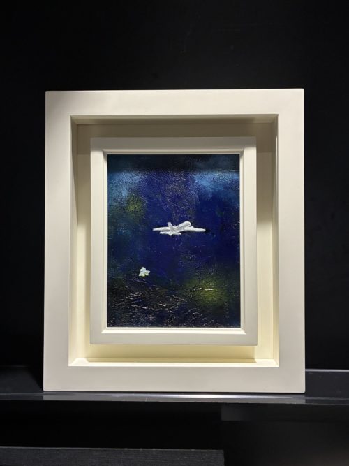 こちらの作品は、真ん中に白で描かれた存在感のある飛行機もチャーミングに添えられたUFOも美しくて素敵ですが、個人的にはバックに広がる見るたびにその表情を変えそうな青や緑の色彩が本当に好きで素晴らしいと思います。